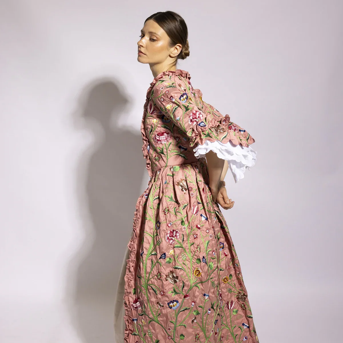 My research process began with closely studying the original apron fragment before digitising and sampling each motif. I tested colour and placement to retain the character of the embroidery while expanding it into a full garment. Drawing on my background in costume, I approached digital embroidery not only as surface decoration, but as an integral part of construction. Motifs were mapped across pattern pieces and seam lines, requiring precise planning to ensure continuity once assembled. The final design was inspired by the robe à la française and robe à l’anglaise, silhouettes contemporary to the original textile.