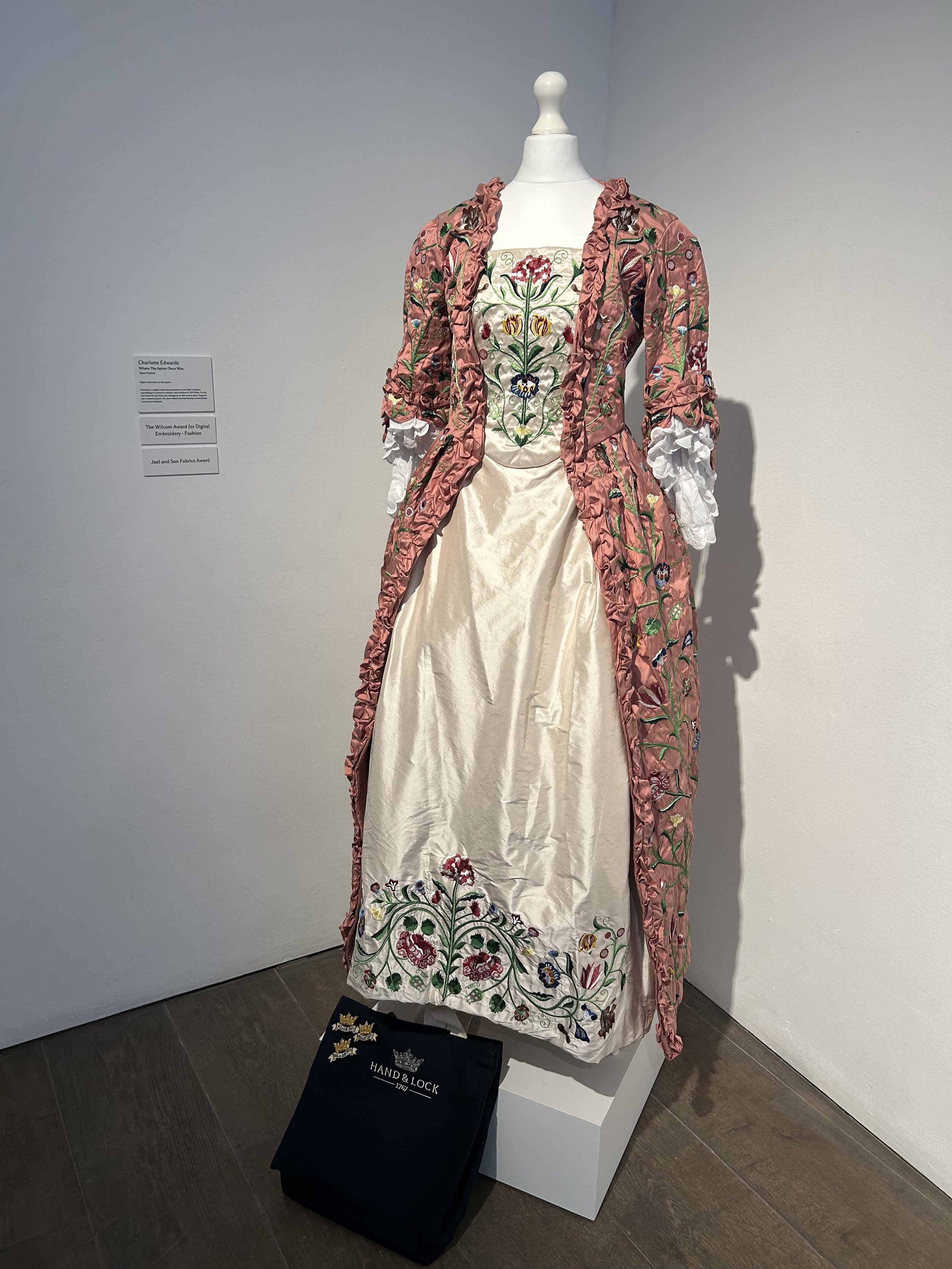 The prize giving was held at Gallery Rosenfeld London in November 2025 and as well as being an open fashion finalist I was awarded two awards. The first was the Wilcom award for digital embroidery: fashion category for ‘outstanding incorporation of digital machine embroidery’ and the second was the Joel & Sons associate award for ‘best use of fabric and materiality whilst incorporating excellence.’ Being recognised by these prestigious organisations including Hand & Lock, marked a significant milestone in my practice, celebrating both the technical complexity of the work and its engagement with historical textiles.